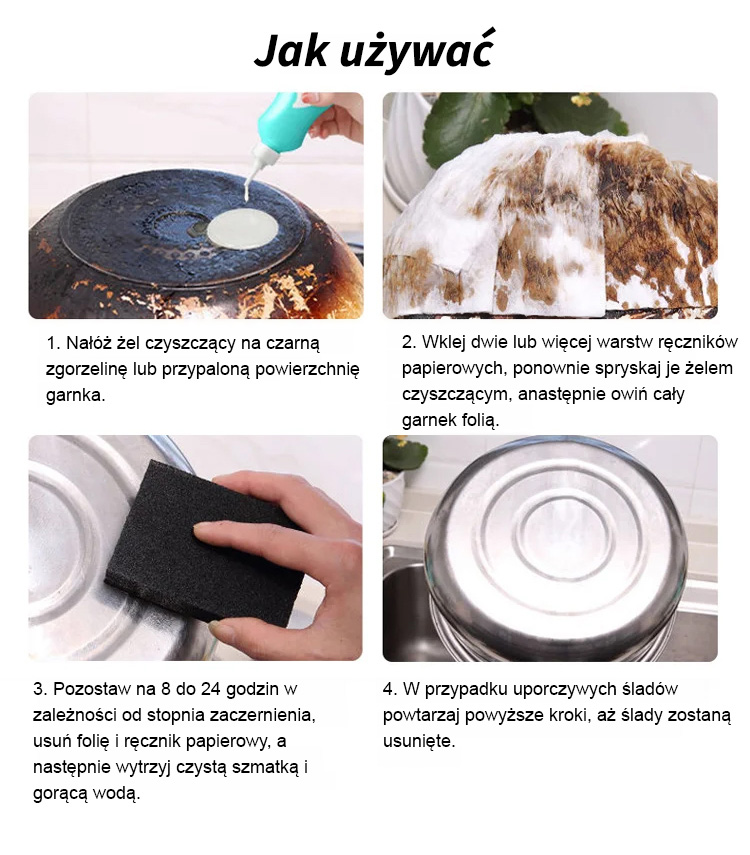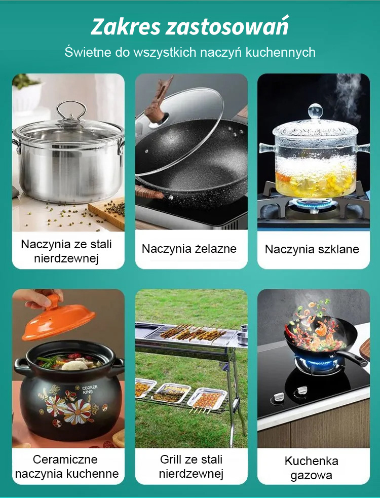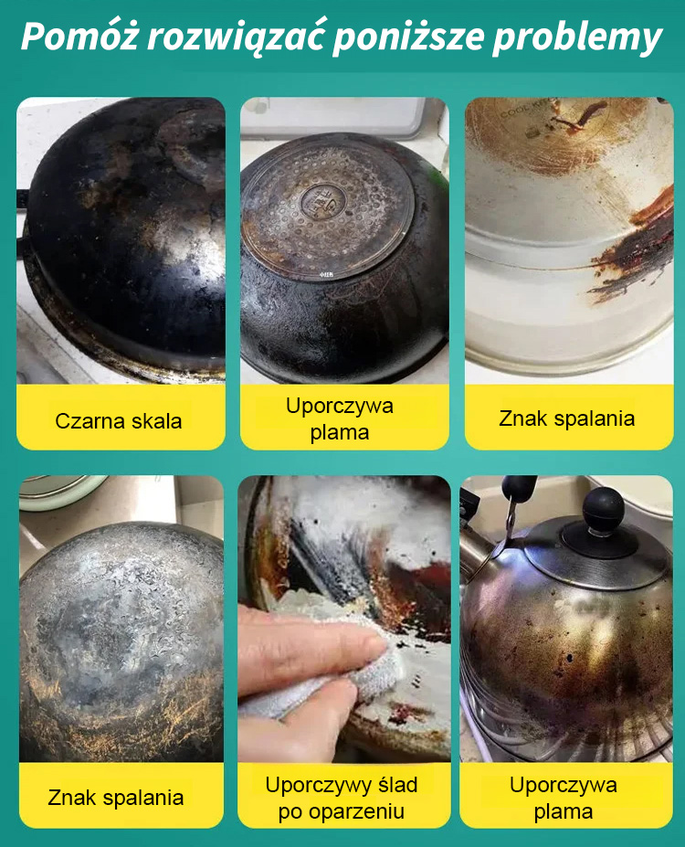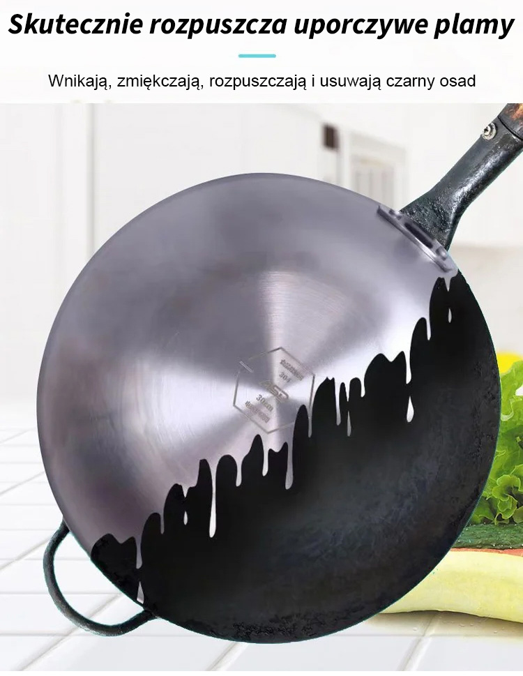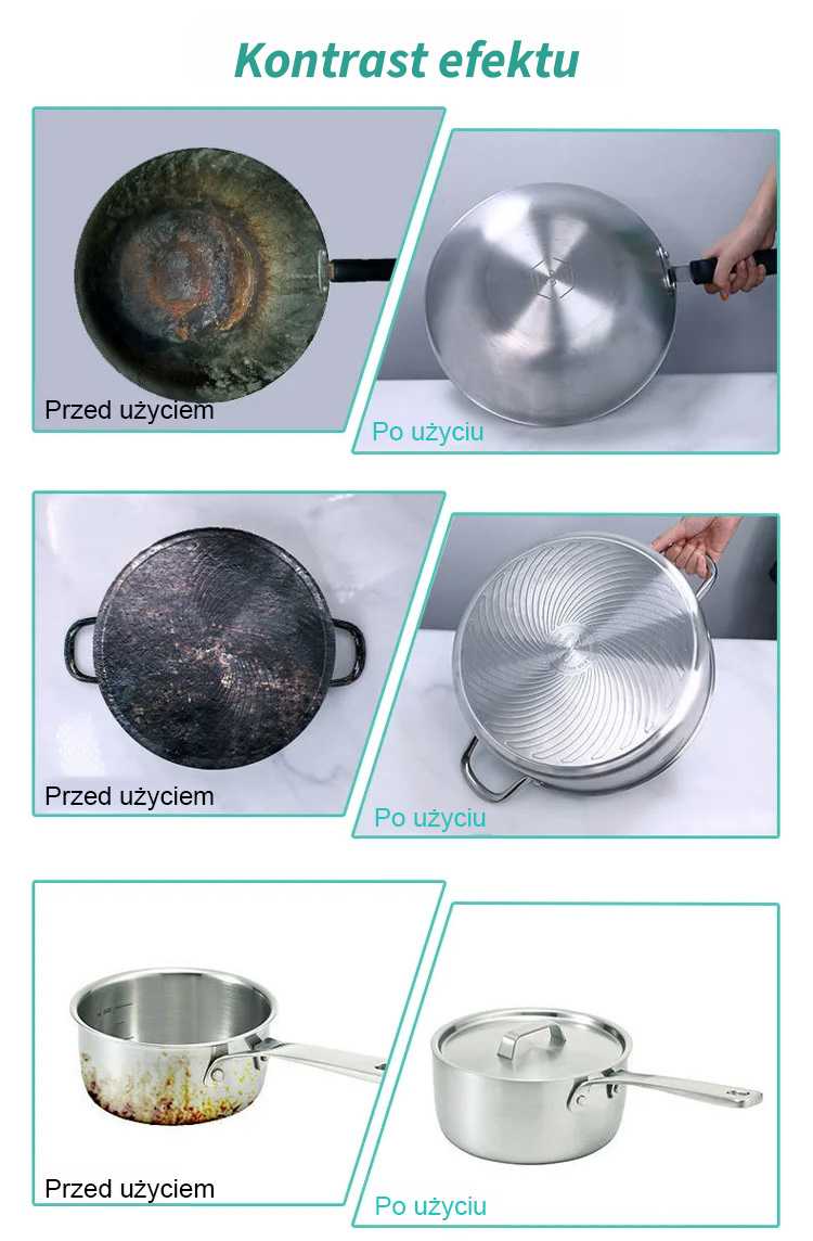 Zaprojektowany specjalnie do usuwania uporczywych plam, ten produkt szybko i skutecznie czyści metalowe powierzchnie, pozostawiając naczynia kuchenne lśniąco czyste. Jego mocna formuła jest bezpieczna i niezawodna, nadaje się do codziennego użytku i z łatwością usuwa różnego rodzaju pozostałości po gotowaniu. Nadaje się do różnych materiałów, nie uszkadzając powierzchni, co czyni go niezbędnym środkiem czyszczącym w kuchni.