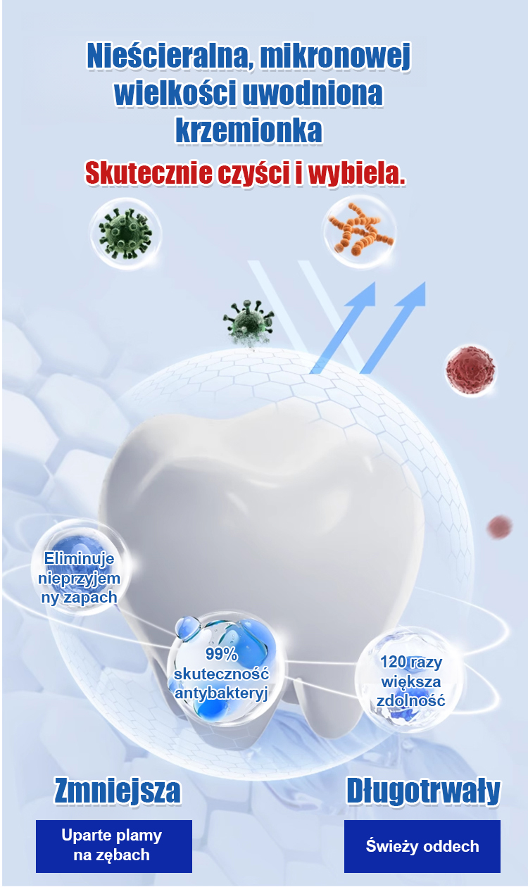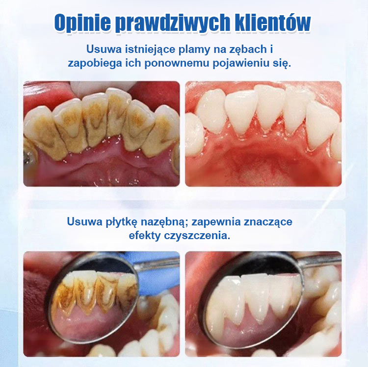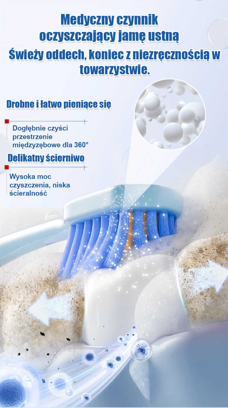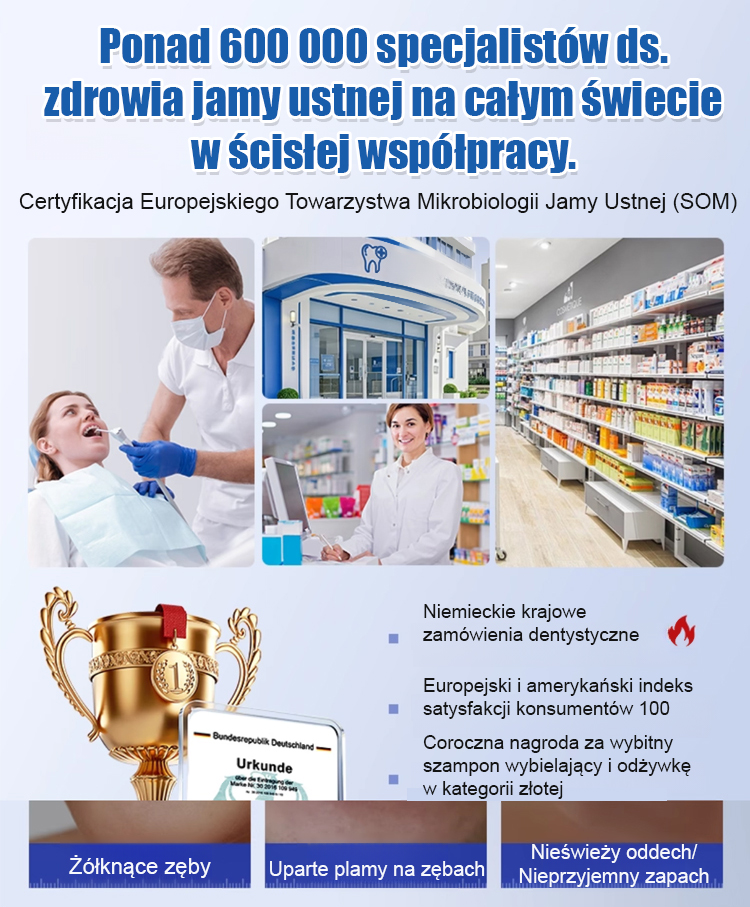 ✨ Probiotyczne mikrogranulki delikatnie rozkładają plamy po kawie i papierosach, nie uszkadzając szkliwa